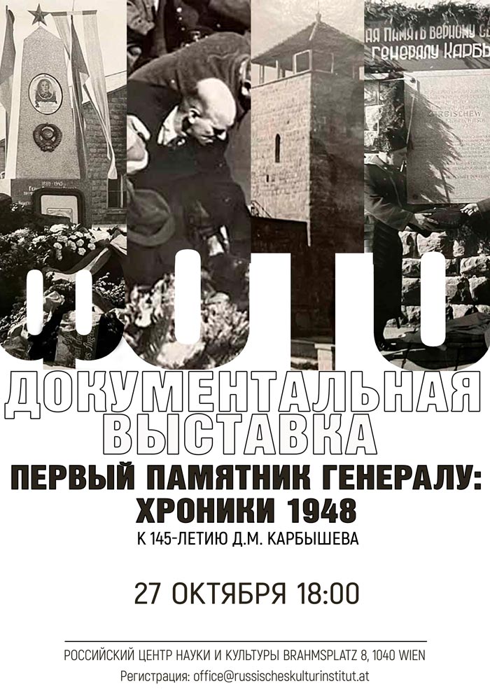 Российский центр науки и культуры в Вене и исследовательский центр «Память» приглашают на выставку уникальных фотографий «Первый памятник генералу. Хроники 1948», посвященную 145 годовщине со дня рождения Героя Советского союза генерал-лейтенанта Д.М. Карбышева.
